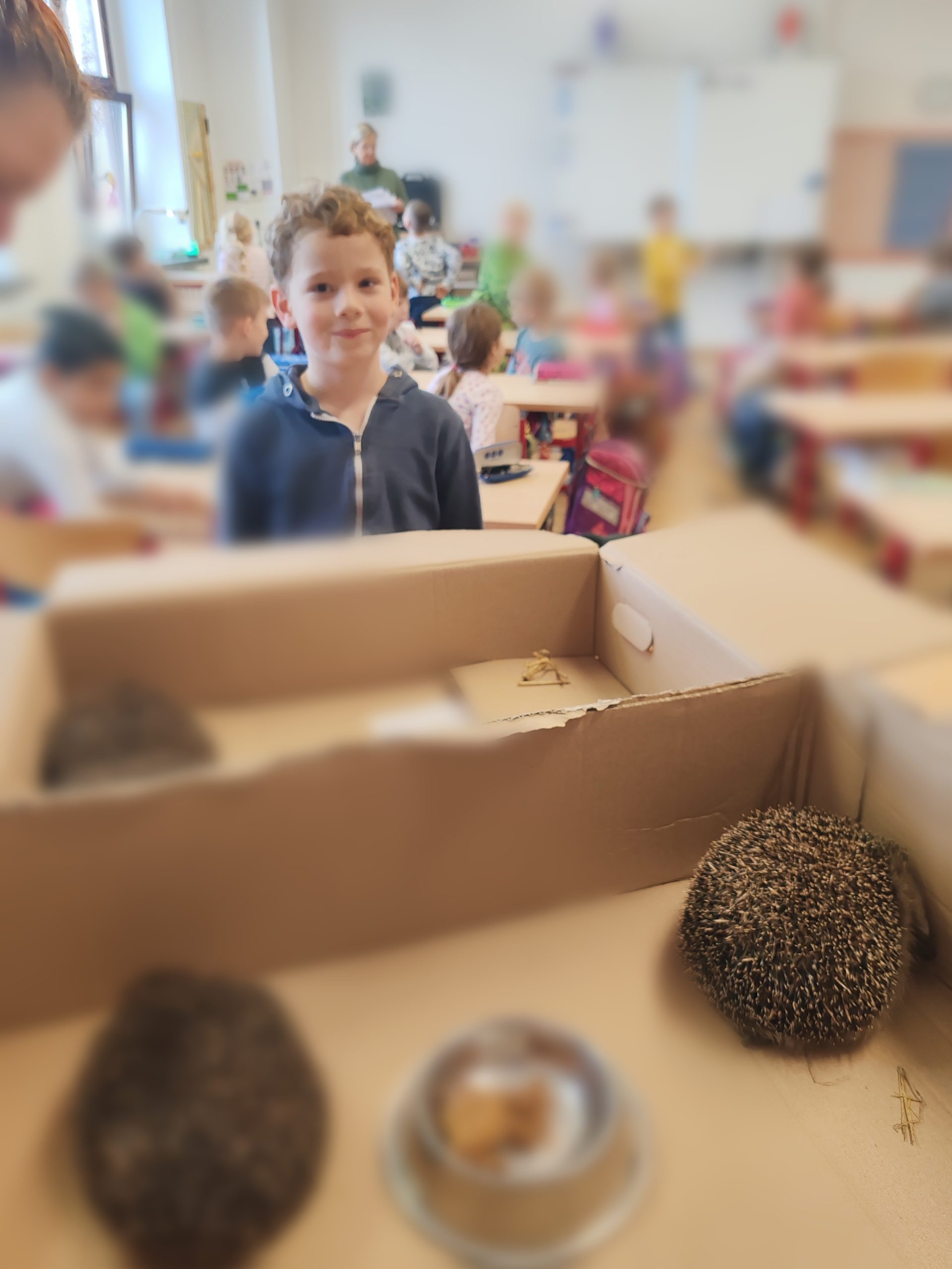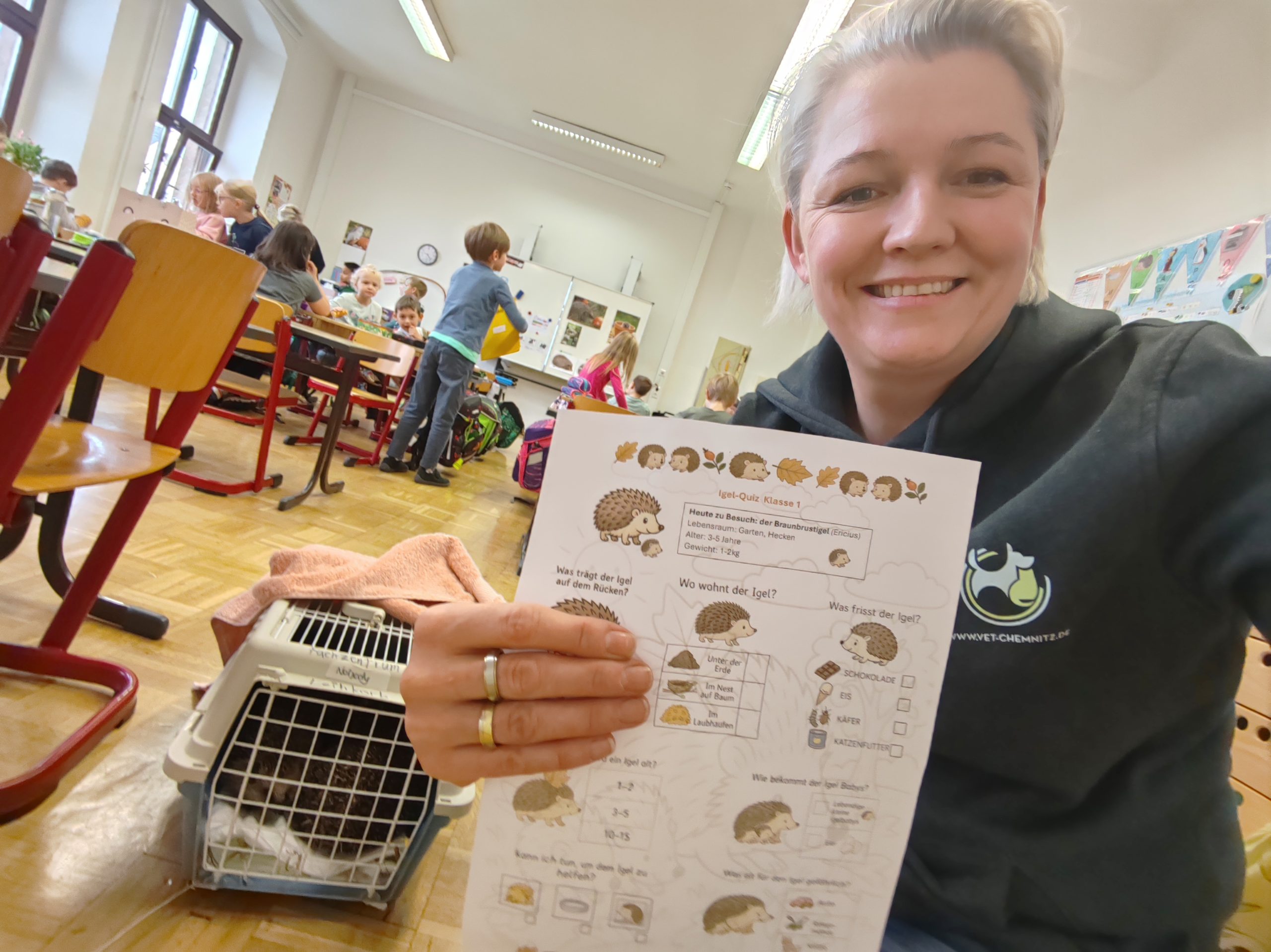 Der heutige Tag war für ein Herzensprojekt der etwas anderen Art verplant. Frau Dr. Theresa Eulitz besuchte heute mit ihren vier, nach Verletzung gesund gepflegten Igel die ersten Klassen einer Grundschule.