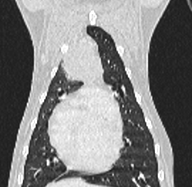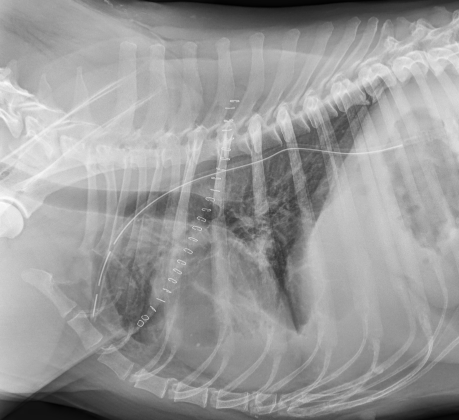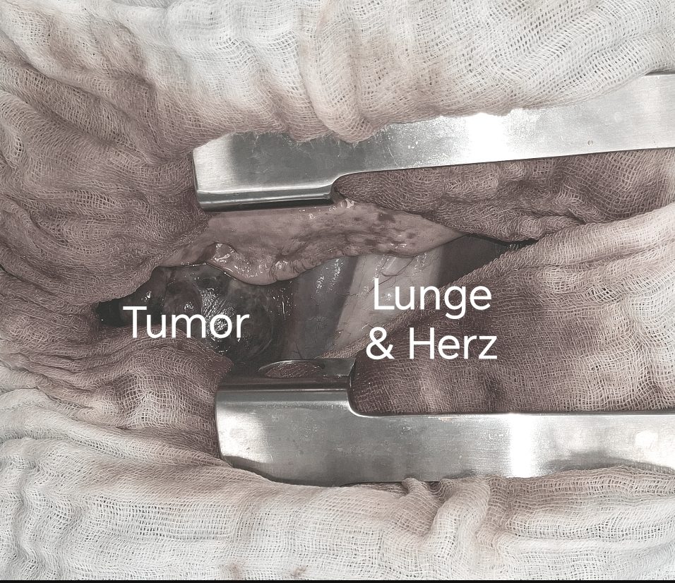 Hashtag, eine große Mischlingshündin, zeigt auf dem Röntgenbild ihres Haustierarztes eine große Masse im Thorax. Nach dem Staging mittels CT und Biopsie bei uns stand fest, eine Operation ist sinnvoll. Aus dem offenen Brustkorb wurde Hashtag ein mandarinengroßer Tumor entfernt. Die Narkose unter künstlicher Beatmung verlief problemlos. Nach Entfernung und dem Brustkorbverschluss unter Einlegen einer Thoraxdrainge, erholte sich Hashtag sehr schnell und wurde nach einigen Tagen entlassen.