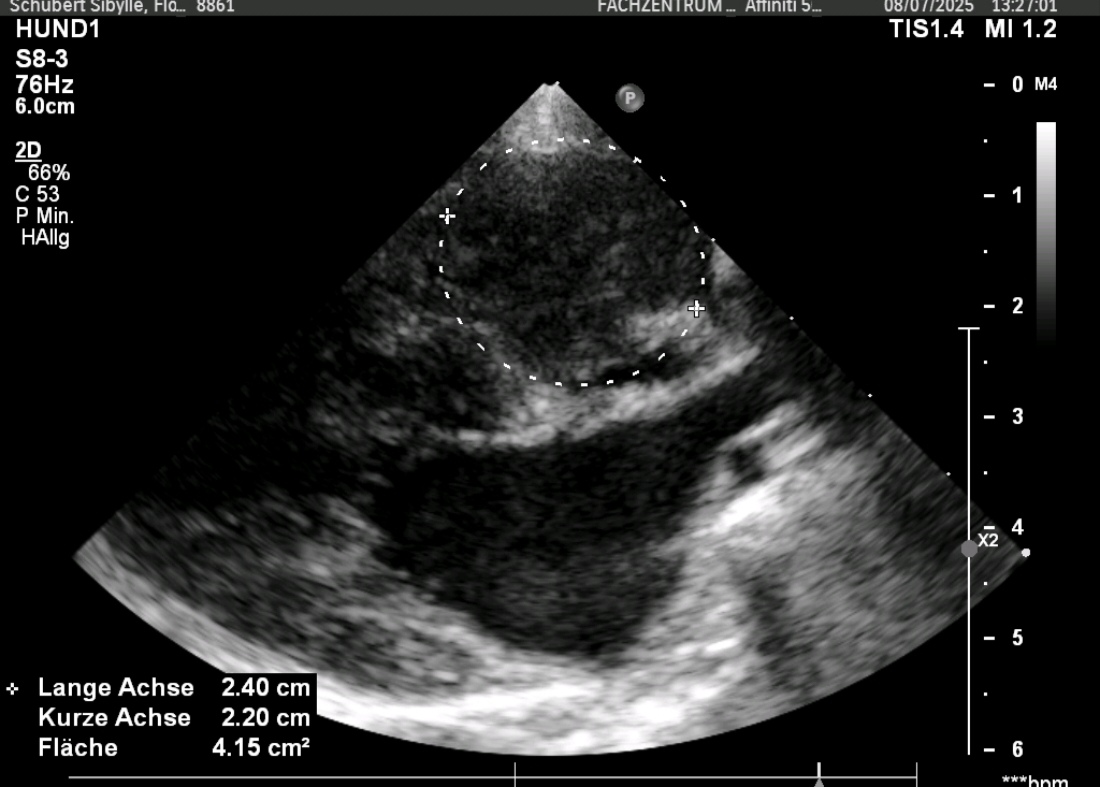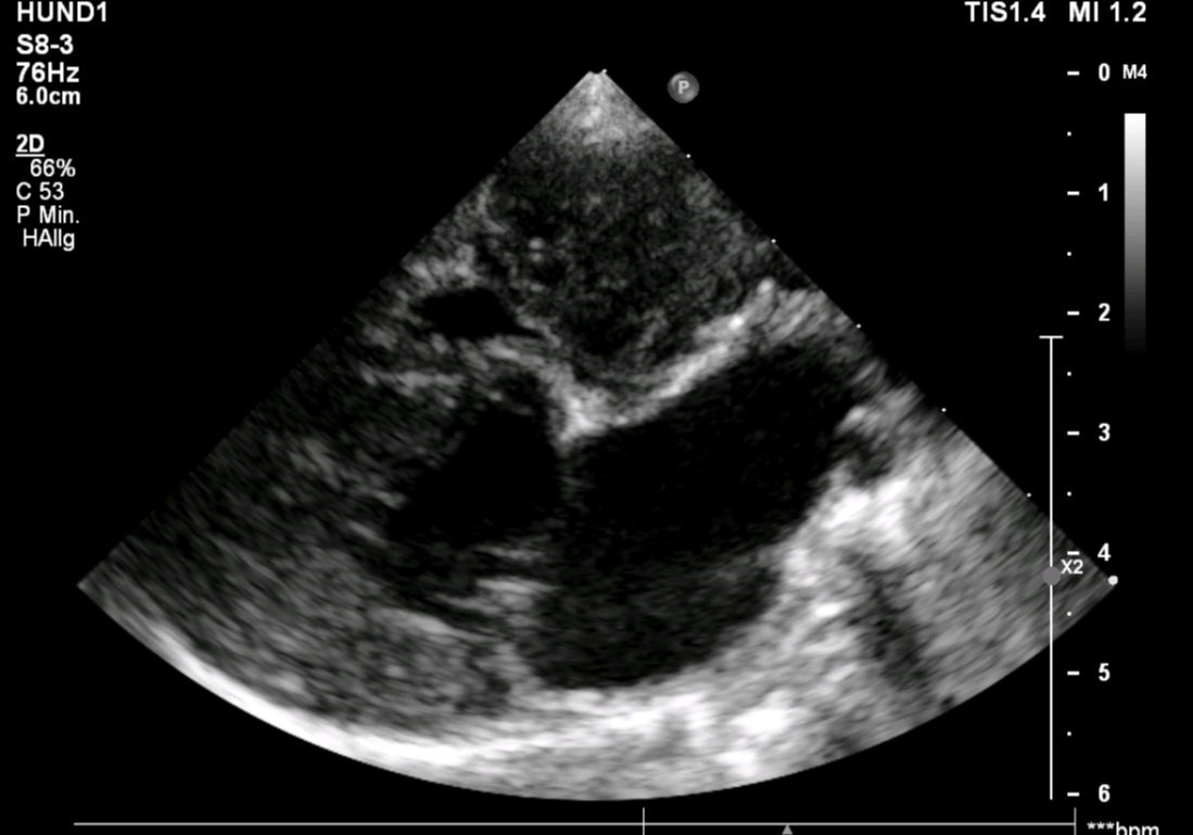 Chihuahua „Peppi“ sollte vor einer anstehenden Zahnsanierung noch mal seine bekannte Mitralendokadiose, sprich Herzklappenerkrankung, gecheckt bekommen. Doch was Frau Dr. Eulitz entdeckte, hatte leider mit dem Vorbefund nichts mehr zu tun. In Peppis rechtem Herzen war ein Tumor gewachsen. Obwohl dieser die rechten Herzanteile deutlich komprimierte und sogar ein leichter Perikarderguss vorlag, war Peppi für seine 13Jahre erstaunlich fit.